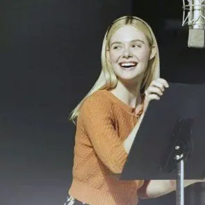 エル・ファニングはいくつかの音楽に合わせて踊っています。彼女は白いタンクトップを着ており、シャツの下にポーキーな乳首を見せています。